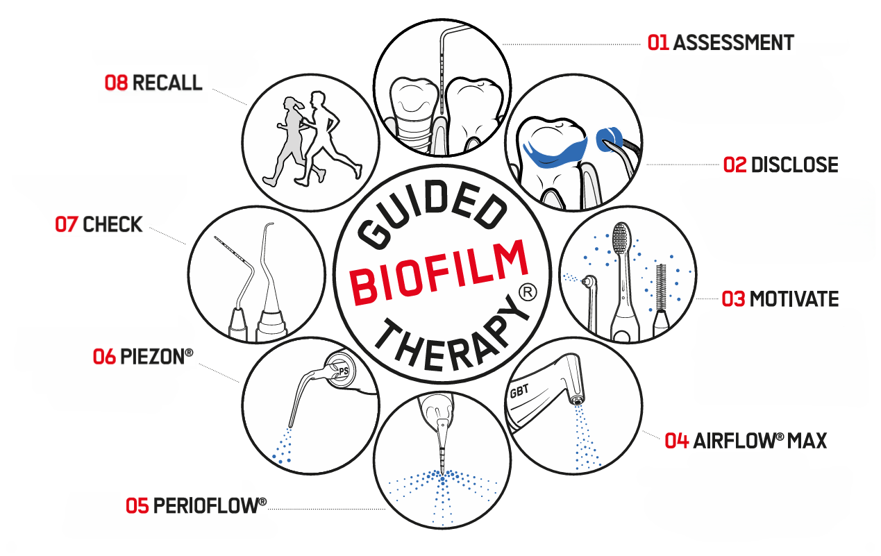 GBT is a comprehensive, structured protocol that focuses on the systematic removal of biofilm (the bacterial layer on teeth and gums), and it emphasizes prevention, maintenance, and personalized care. It uses a combination of diagnostic tools and dental equipment, such as the Airflow device, to clean and treat the teeth and gums.